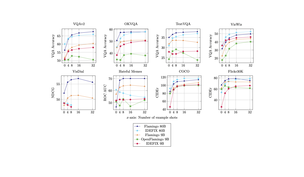 The model shows strong in-context few-shot learning capabilities and is on par with the closed-source model. This makes IDEFICS a robust starting point to fine-tune multimodal models on custom data.