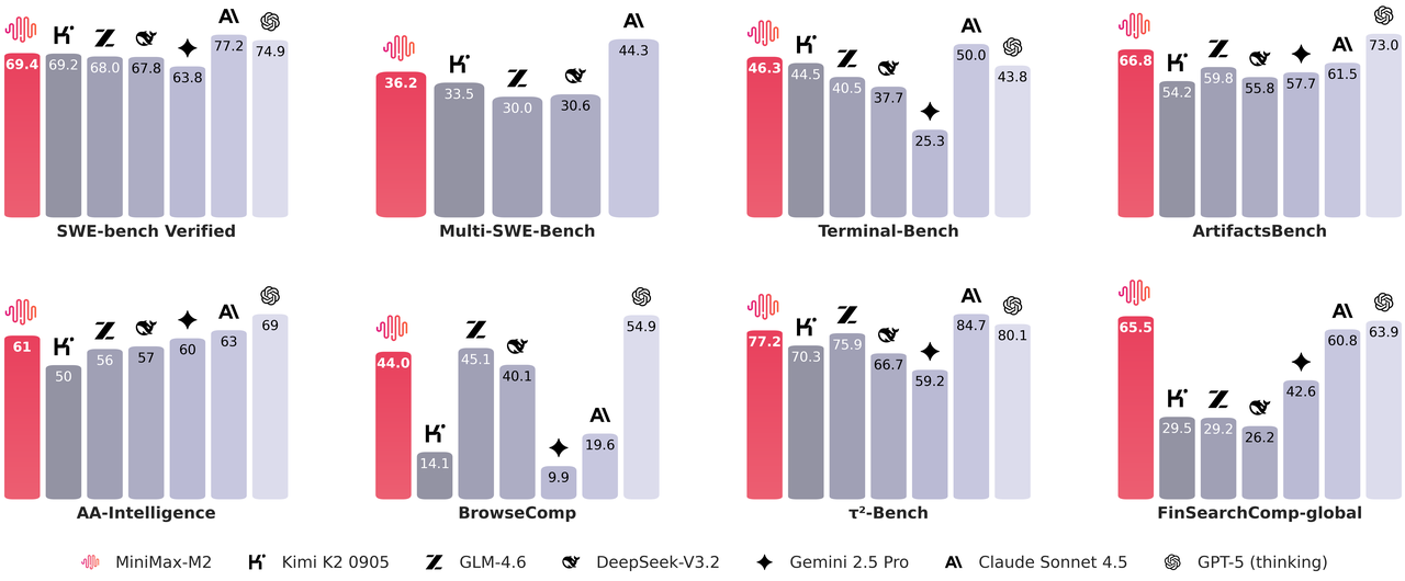 | **Metric (AA)** | **MiniMax-M2** | **Claude Sonnet 4** | **Claude Sonnet 4.5** | **Gemini 2.5 Pro** | **GPT-5 (thinking)** | **GLM-4.6** | **Kimi K2 0905** | **DeepSeek-V3.2** |