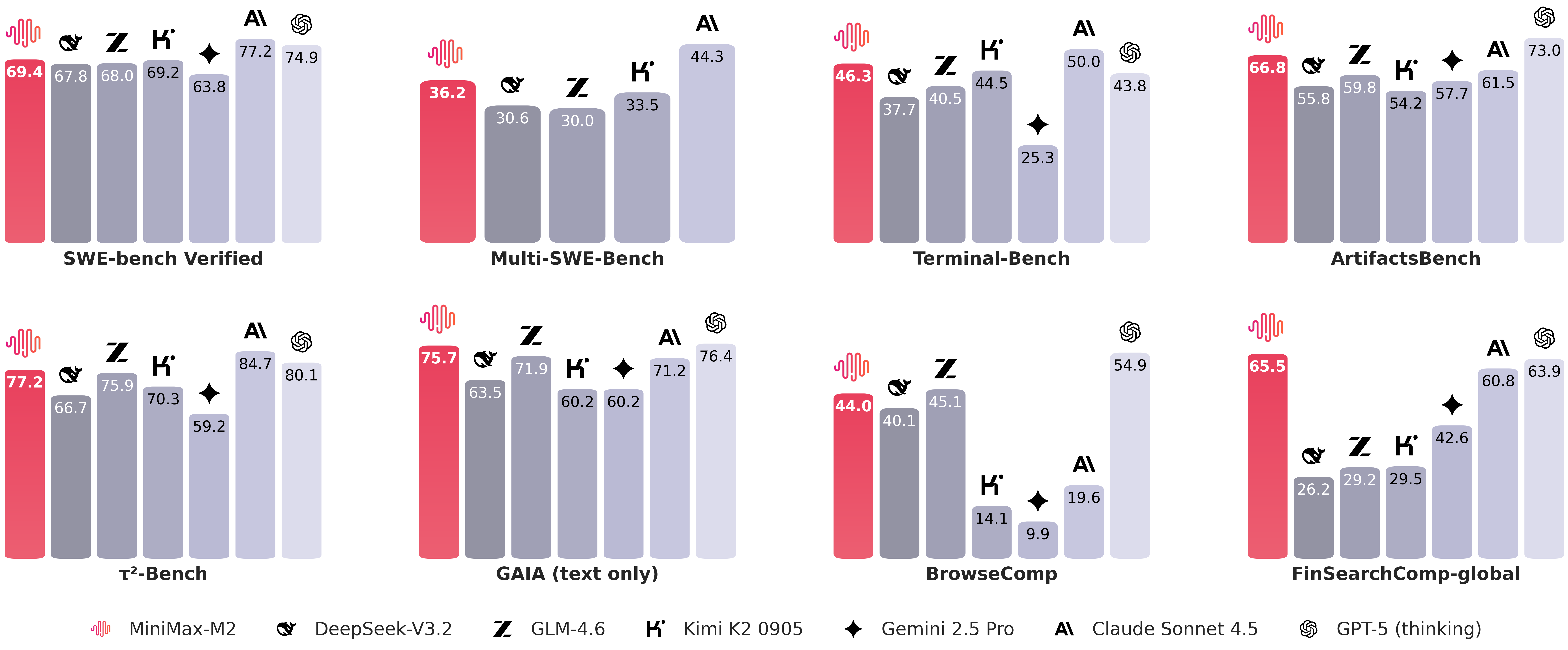 --- ## Highlights **Superior Intelligence**. According to benchmarks from Artificial Analysis, MiniMax-M2 demonstrates highly competitive general intelligence across mathematics, science, instruction following, coding, and agentic tool use. **Its composite score ranks #1 among open-source models globally**. **Advanced Coding**. Engineered for end-to-end developer workflows, MiniMax-M2 excels at multi-file edits, coding-run-fix loops, and test-validated repairs. Strong performance on Terminal-Bench and (Multi-)SWE-Bench–style tasks demonstrates practical effectiveness in terminals, IDEs, and CI across languages. **Agent Performance**. MiniMax-M2 plans and executes complex, long-horizon toolchains across shell, browser, retrieval, and code runners. In BrowseComp-style evaluations, it consistently locates hard-to-surface sources, maintains evidence traceable, and gracefully recovers from flaky steps. **Efficient Design**. With 10 billion activated parameters (230 billion in total), MiniMax-M2 delivers lower latency, lower cost, and higher throughput for interactive agents and batched sampling—perfectly aligned with the shift toward highly deployable models that still shine on coding and agentic tasks. --- ## Coding & Agentic Benchmarks These comprehensive evaluations test real-world end-to-end coding and agentic tool use: editing real repos, executing commands, browsing the web, and delivering functional solutions. Performance on this suite correlates with day-to-day developer experience in terminals, IDEs, and CI. | **Benchmark** | **MiniMax-M2** | **Claude Sonnet 4** | **Claude Sonnet 4.5** | **Gemini 2.5 Pro** | **GPT-5 (thinking)** | **GLM-4.6** | **Kimi K2 0905** | **DeepSeek-V3.2** | |-----------|------------|-----------------|-------------------|-----------------|------------------|---------|---------------|----------------| | **SWE-bench Verified** | 69.4 | 72.7 * | 77.2 * | 63.8 * | 74.9 * | 68 * | 69.2 * | 67.8 * | | **Multi-SWE-Bench** | 36.2 | 35.7 * | 44.3 | / | / | 30 | 33.5 | 30.6 | | **SWE-bench Multilingual** | 56.5 | 56.9 * | 68 | / | / | 53.8 | 55.9 * | 57.9 * | | **Terminal-Bench** | 46.3 | 36.4 * | 50 * | 25.3 * | 43.8 * | 40.5 * | 44.5 * | 37.7 * | | **ArtifactsBench** | 66.8 | 57.3* | 61.5 | 57.7* | 73* | 59.8 | 54.2 | 55.8 | | **BrowseComp** | 44 | 12.2 | 19.6 | 9.9 | 54.9* | 45.1* | 14.1 | 40.1* | | **BrowseComp-zh** | 48.5 | 29.1 | 40.8 | 32.2 | 65 | 49.5 | 28.8 | 47.9* | | **GAIA (text only)** | 75.7 | 68.3 | 71.2 | 60.2 | 76.4 | 71.9 | 60.2 | 63.5 | | **xbench-DeepSearch** | 72 | 64.6 | 66 | 56 | 77.8 | 70 | 61 | 71 | | **HLE (w/ tools)** | 31.8 | 20.3 | 24.5 | 28.4 * | 35.2 * | 30.4 * | 26.9 * | 27.2 * | | **τ²-Bench** | 77.2 | 65.5* | 84.7* | 59.2 | 80.1* | 75.9* | 70.3 | 66.7 | | **FinSearchComp-global** | 65.5 | 42 | 60.8 | 42.6* | 63.9* | 29.2 | 29.5* | 26.2 | | **AgentCompany** | 36 | 37 | 41 | 39.3* | / | 35 | 30 | 34 | >Notes: Data points marked with an asterisk (*) are taken directly from the model's official tech report or blog. All other metrics were obtained using the evaluation methods described below. >- SWE-bench Verified: We use the same scaffold as [R2E-Gym](https://arxiv.org/pdf/2504.07164) (Jain et al. 2025) on top of OpenHands to test with agents on SWE tasks. All scores are validated on our internal infrastructure with 128k context length, 100 max steps, and no test-time scaling. All git-related content is removed to ensure agent sees only the code at the issue point. >- Multi-SWE-Bench & SWE-bench Multilingual: All scores are averaged across 8 runs using the [claude-code](https://github.com/anthropics/claude-code) CLI (300 max steps) as the evaluation scaffold. >- Terminal-Bench: All scores are evaluated with the official claude-code from the original [Terminal-Bench](https://www.tbench.ai/) repository(commit `94bf692`), averaged over 8 runs to report the mean pass rate. >- ArtifactsBench: All Scores are computed by averaging three runs with the official implementation of [ArtifactsBench](https://github.com/Tencent-Hunyuan/ArtifactsBenchmark), using the stable Gemini-2.5-Pro as the judge model. >- BrowseComp & BrowseComp-zh & GAIA (text only) & xbench-DeepSearch: All scores reported use the same agent framework as [WebExplorer](https://arxiv.org/pdf/2509.06501) (Liu et al. 2025), with minor tools description adjustment. We use the 103-sample text-only GAIA validation subset following [WebExplorer](https://arxiv.org/pdf/2509.06501) (Liu et al. 2025). >- HLE (w/ tools): All reported scores are obtained using search tools and a Python tool. The search tools employ the same agent framework as [WebExplorer](https://arxiv.org/pdf/2509.06501) (Liu et al. 2025), and the Python tool runs in a Jupyter environment. We use the text-only HLE subset. >- τ²-Bench: All scores reported use "extended thinking with tool use", and employ GPT-4.1 as the user simulator. >- FinSearchComp-global: Official results are reported for GPT-5-Thinking, Gemini 2.5 Pro, and Kimi-K2. Other models are evaluated using the open-source [FinSearchComp](https://arxiv.org/pdf/2509.13160) (Hu et al. 2025) framework using both search and Python tools, launched simultaneously for consistency. >- AgentCompany: All scores reported use OpenHands 0.42 agent framework. --- ## Intelligence Benchmarks We align with **Artificial Analysis**, which aggregates challenging benchmarks using a consistent methodology to reflect a model’s broader **intelligence profile** across math, science, instruction following, coding, and agentic tool use. | **Metric (AA)** | **MiniMax-M2** | **Claude Sonnet 4** | **Claude Sonnet 4.5** | **Gemini 2.5 Pro** | **GPT-5 (thinking)** | **GLM-4.6** | **Kimi K2 0905** | **DeepSeek-V3.2** | |-----------------|----------------|---------------------|------------------------|---------------------|----------------------|-------------|------------------|-------------------| | AIME25 | 78 | 74 | 88 | 88 | 94 | 86 | 57 | 88 | | MMLU-Pro | 82 | 84 | 88 | 86 | 87 | 83 