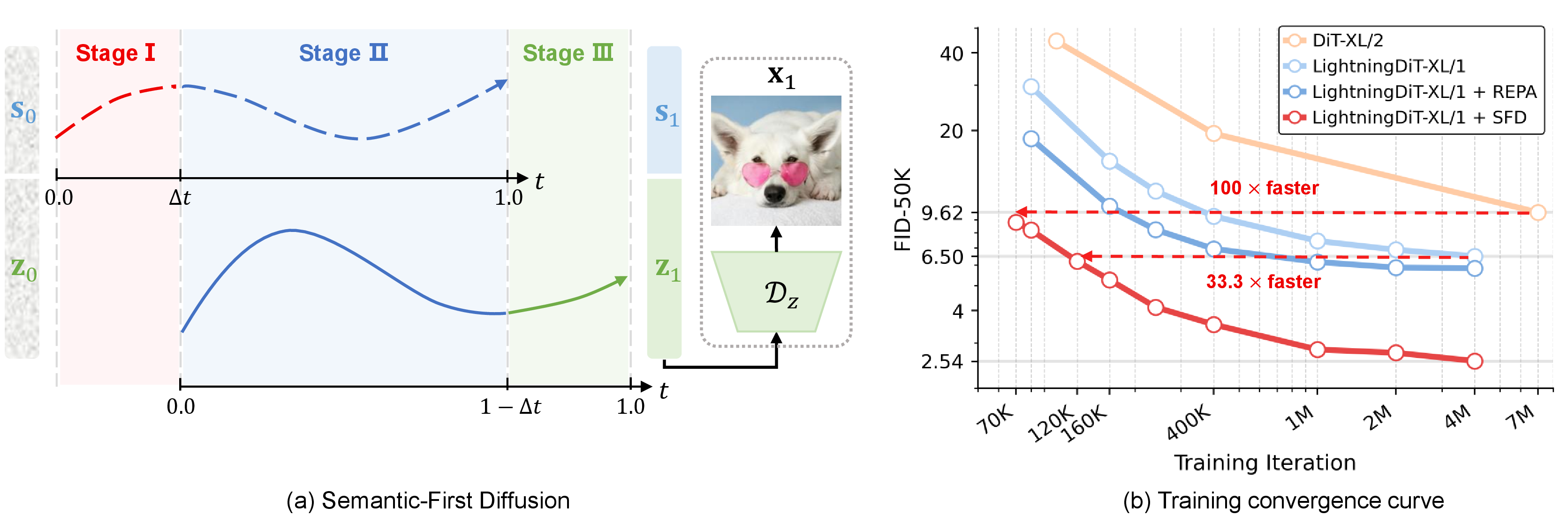 (a) Overview of Semantic-First Diffusion (SFD). Semantics (dashed curve) and textures (solid curve) follow asynchronous denoising trajectories. SFD operates in three phases: Stage I β Semantic initialization, where semantic latents denoise first; Stage II β Asynchronous generation, where semantics and textures denoise jointly but asynchronously, with semantics ahead of textures; Stage III β Texture completion, where only textures continue refining. After denoising, the generated semantic latent sβ is discarded, and the final image is decoded solely from the texture latent zβ. (b) Training convergence on ImageNet 256Γ256 without guidance. SFD achieves substantially faster convergence than DiT-XL/2 and LightningDiT-XL/1 by approximately 100Γ and 33.3Γ, respectively.