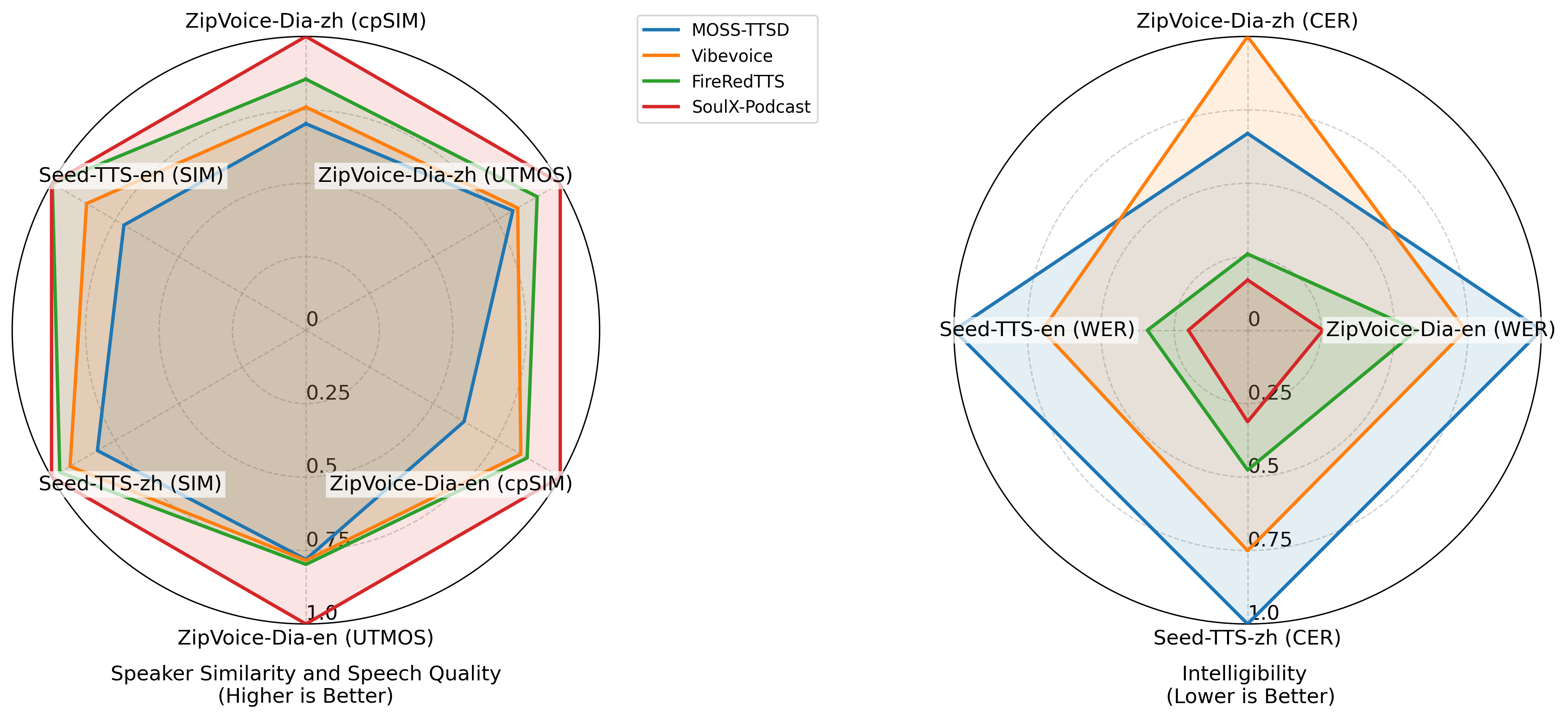 Long-form, multi-turn, multi-speaker dialogic speech generation: SoulX-Podcast excels in generating high-quality, natural-sounding dialogic speech for multi-turn, multi-speaker scenarios.