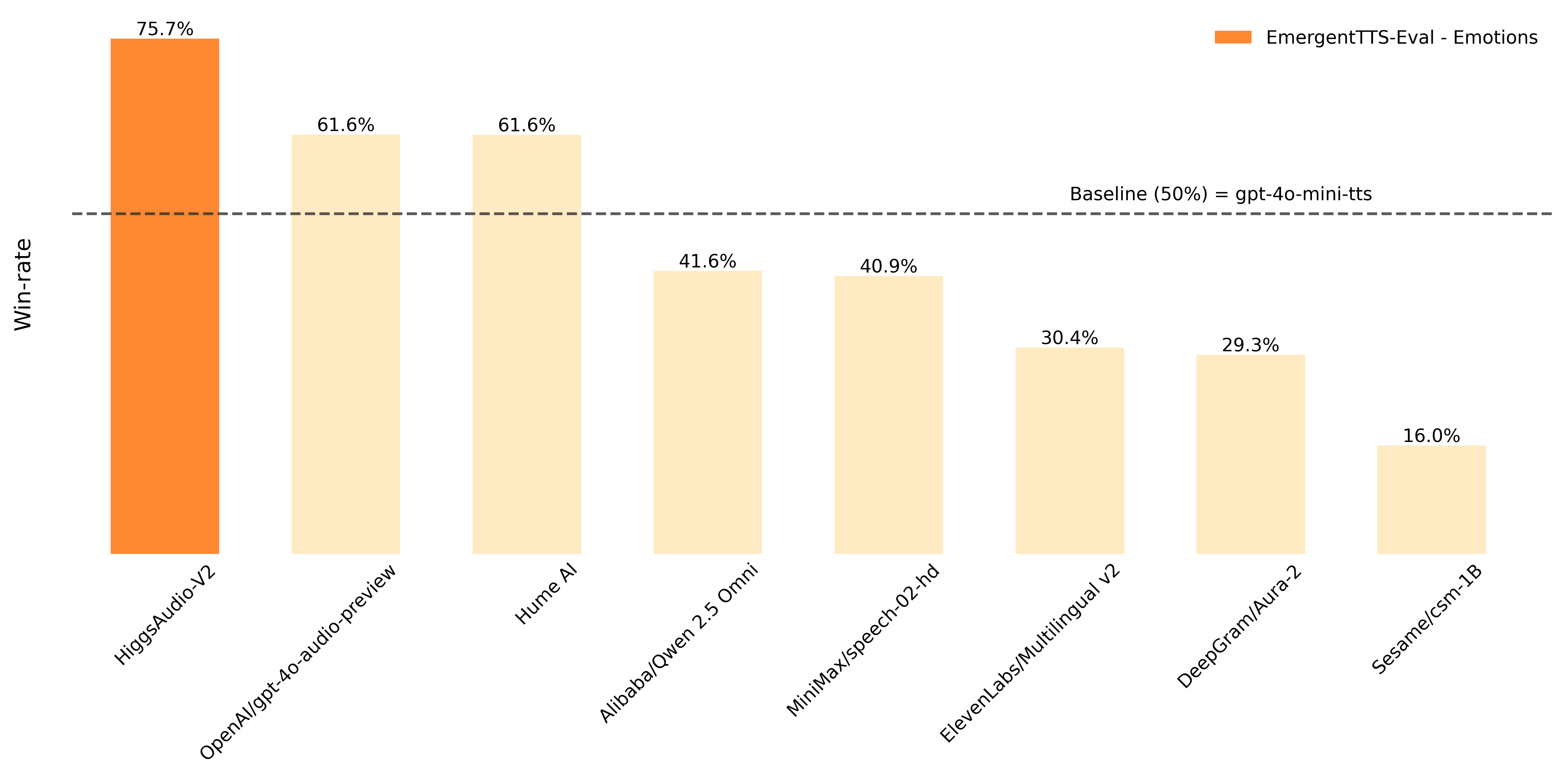Following the EmergentTTS-Eval Paper, we report the win-rate over "gpt-4o-mini-tts" with the "alloy" voice. Results of Higgs Audio v2 is obtained with the voice of "belinda". The judge model is Gemini 2.5 Pro.