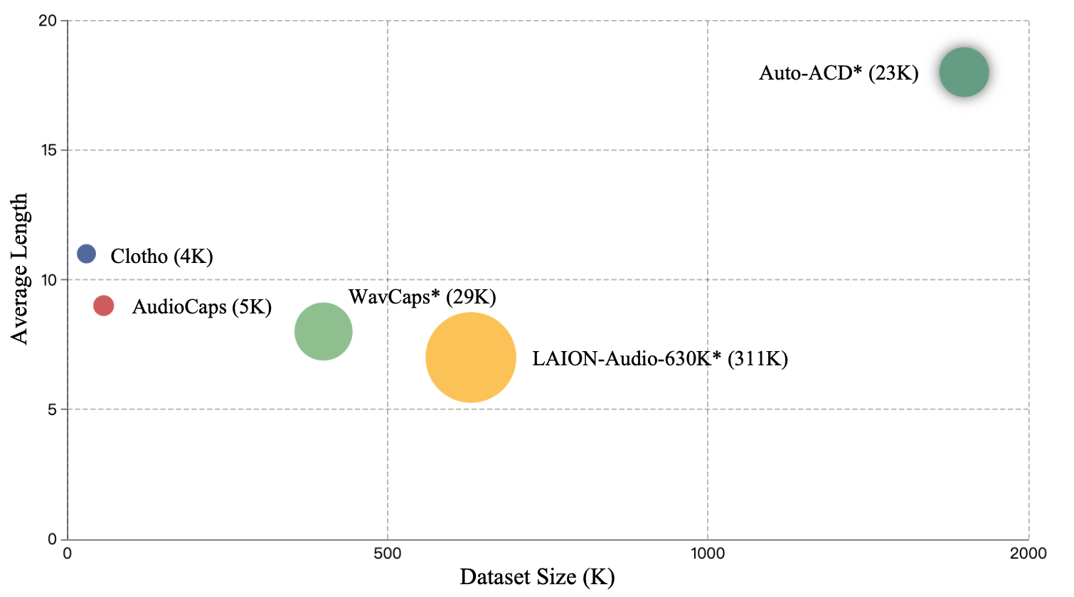 Auto-ACD, comprising over 1.9M audio-text pairs. As shown in figure, The text descriptions in Auto-ACD contain long texts (18 words) and diverse vocabularies (23K), and provide information about the surrounding auditory environment(data point with shadow) in which sounds take place.