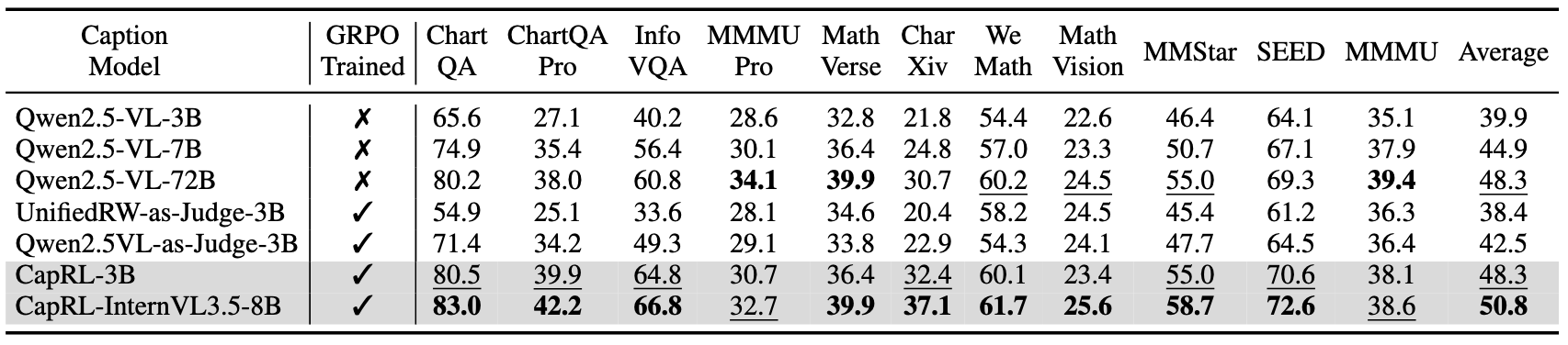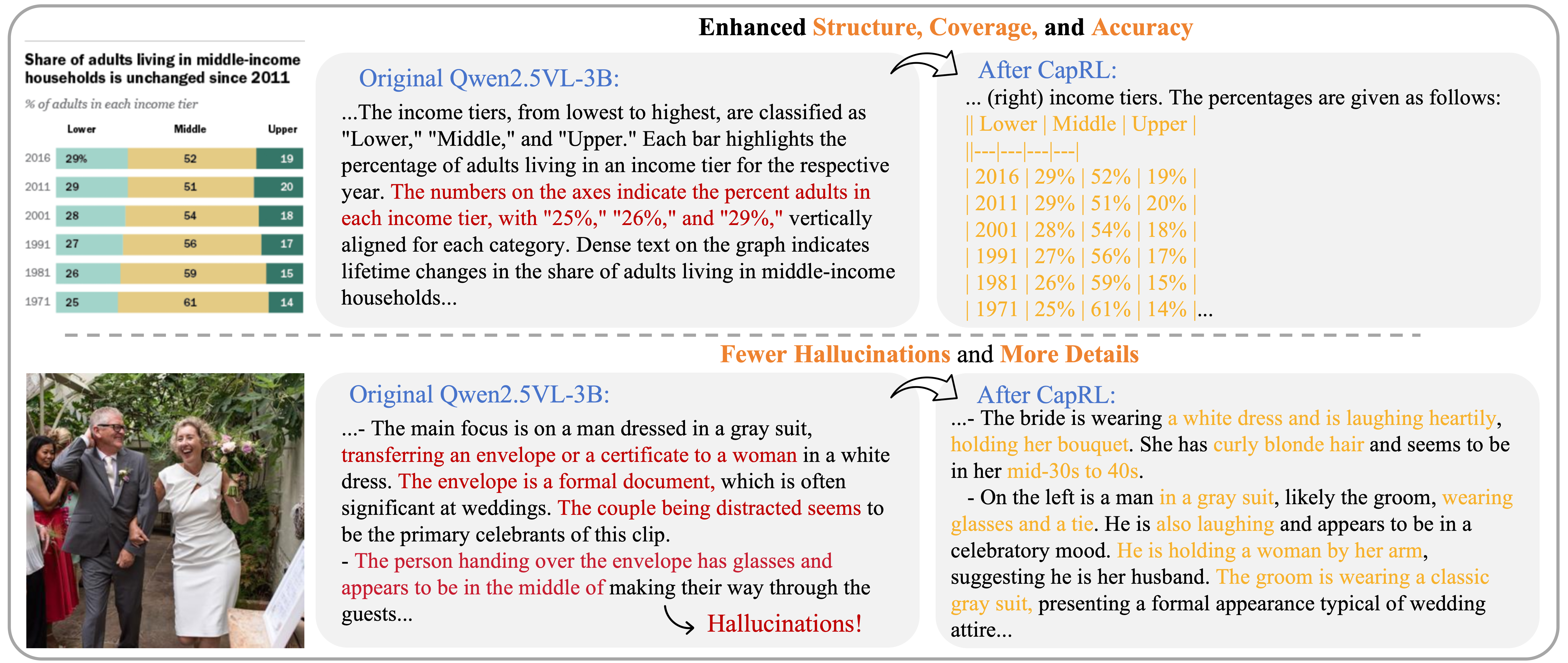 - Remarkable visual understanding for Chart, Infographics and Document: CapRL-3B achieves perception accuracy and visual information coverage comparable to Qwen2.5-VL-72B.