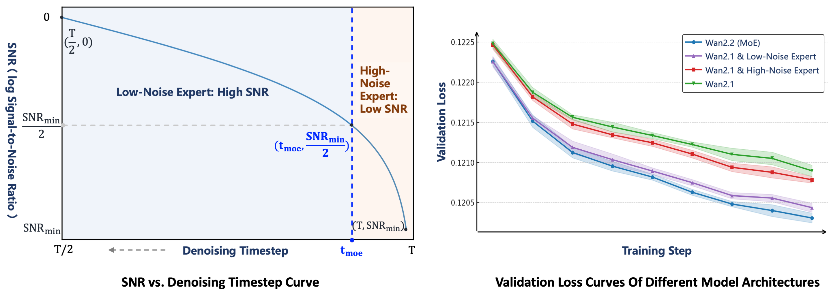 The transition point between the two experts is determined by the signal-to-noise ratio (SNR), a metric that decreases monotonically as the denoising step $t$ increases. At the beginning of the denoising process, $t$ is large and the noise level is high, so the SNR is at its minimum, denoted as ${SNR}{min}$. In this stage, the high-noise expert is activated. We define a threshold step ${t}{moe}$ corresponding to half of the ${SNR}{min}$, and switch to the low-noise expert when $t<{t}{moe}$.