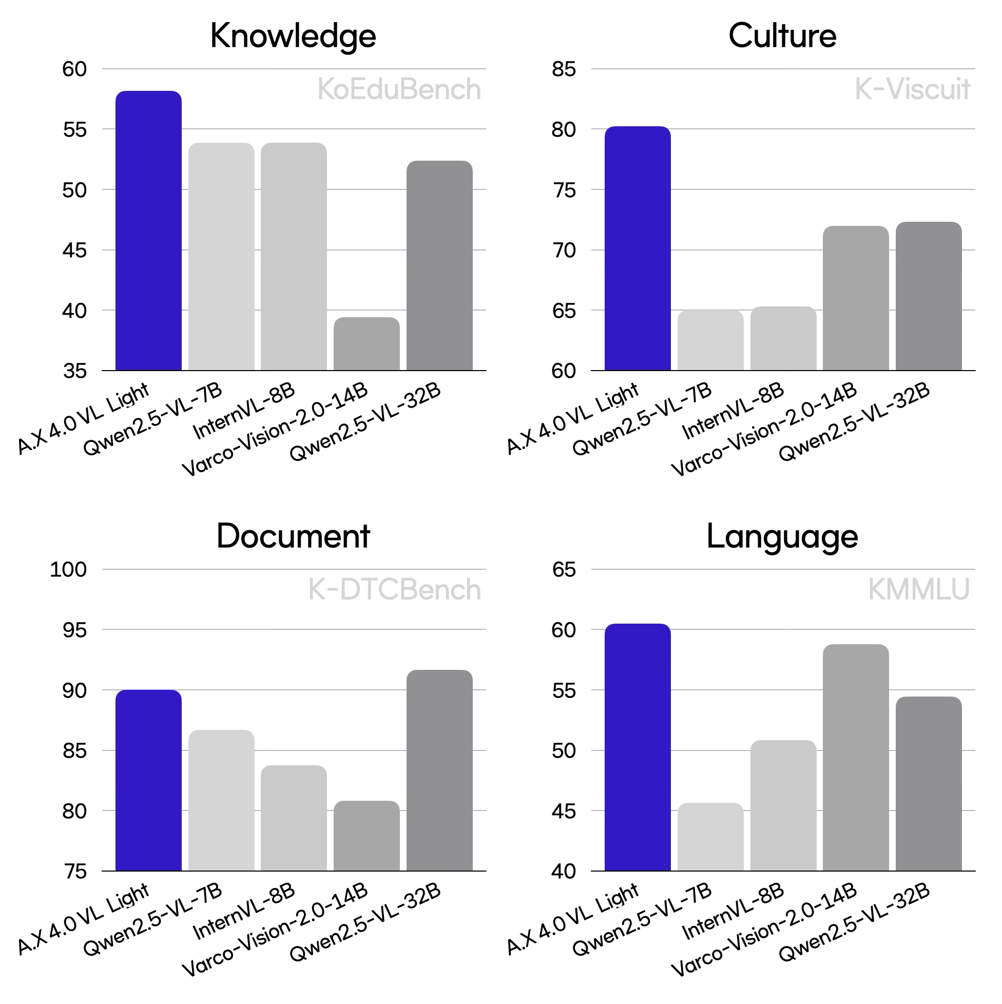 A.X 4.0 VL Light (pronounced “A dot X”) is a vision-language model (VLM) optimized for Korean vision and language understanding as well as enterprise deployment. Built upon A.X 4.0 Light, A.X 4.0 VL Light has been further trained on diverse multimodal datasets, with a particular focus on large-scale multimodal Korean datasets, to deliver exceptional performance in domestic business applications.